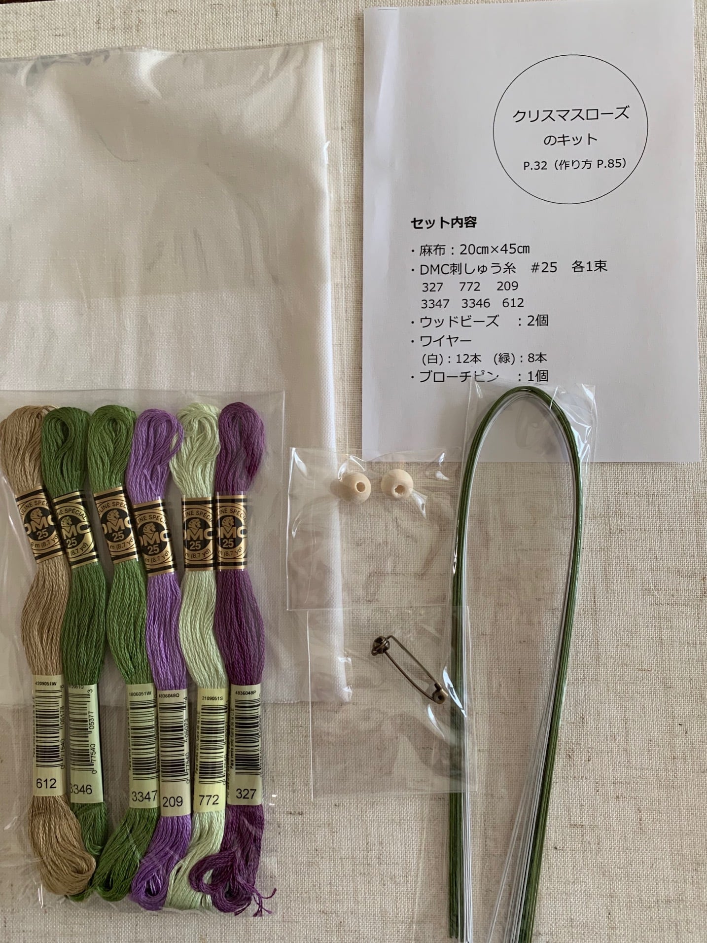 クリスマスローズを制作する糸・ワイヤー・木玉・ブローチピンの材料セットになっています。