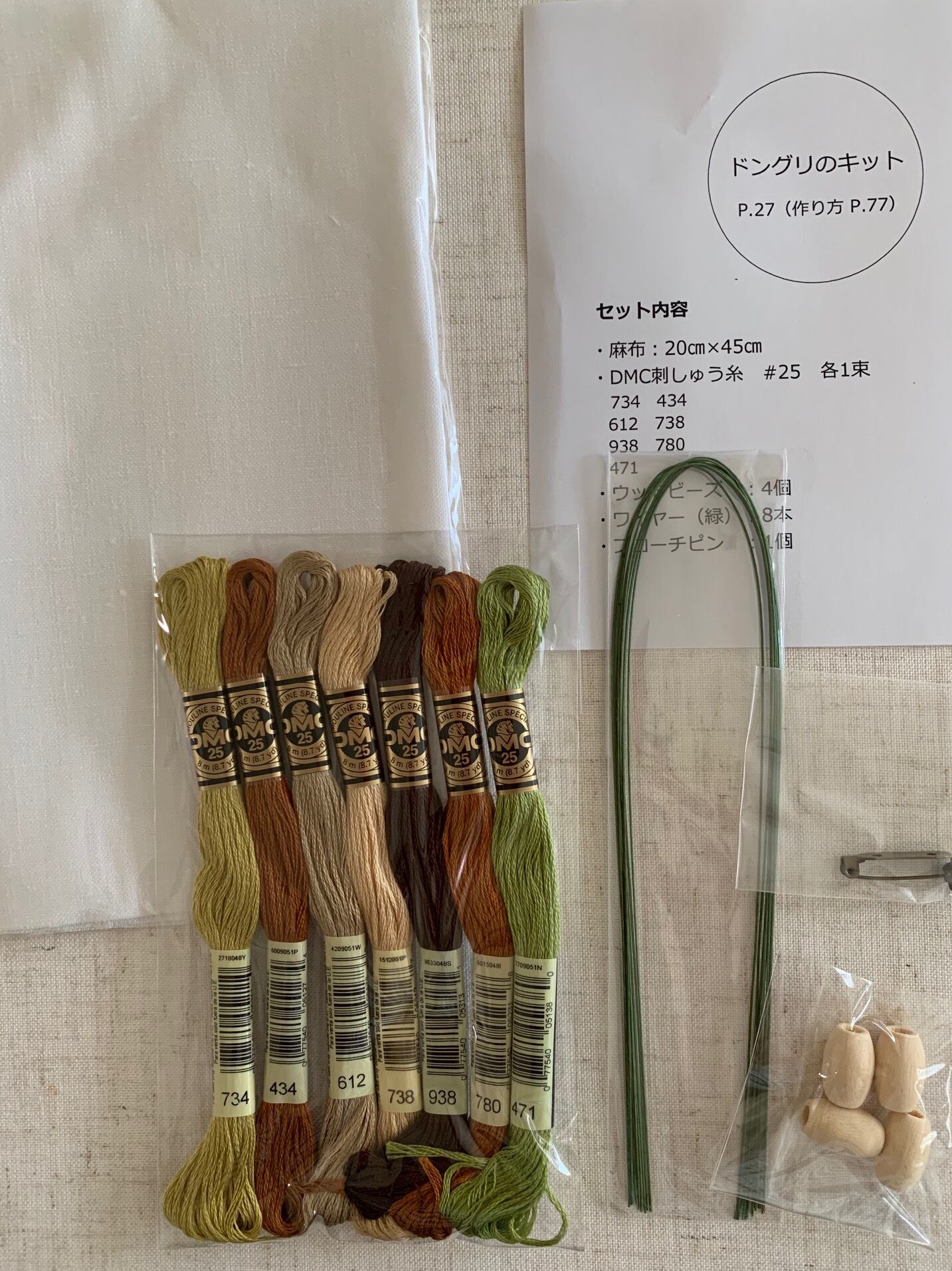 ドングリを制作する糸・ワイヤー・木玉・ブローチピンの材料セットになっています。