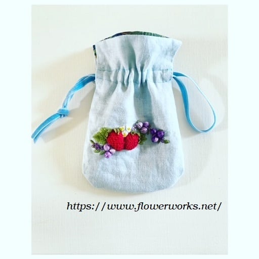 巾着の材料 .刺繍の材料と巾着の作り方.巾着の型紙も入っています。