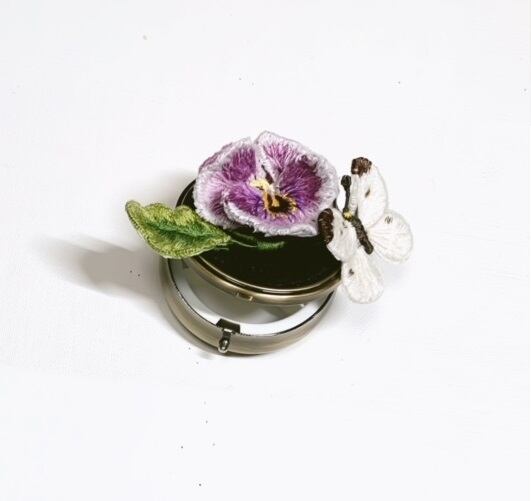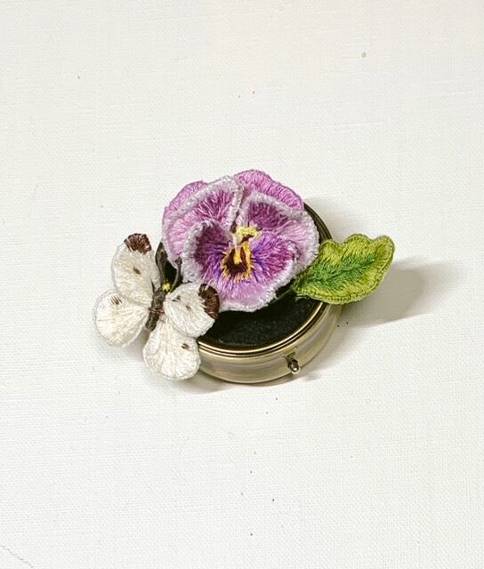 立体刺繡のパンジーの花を付けた小物入れです。