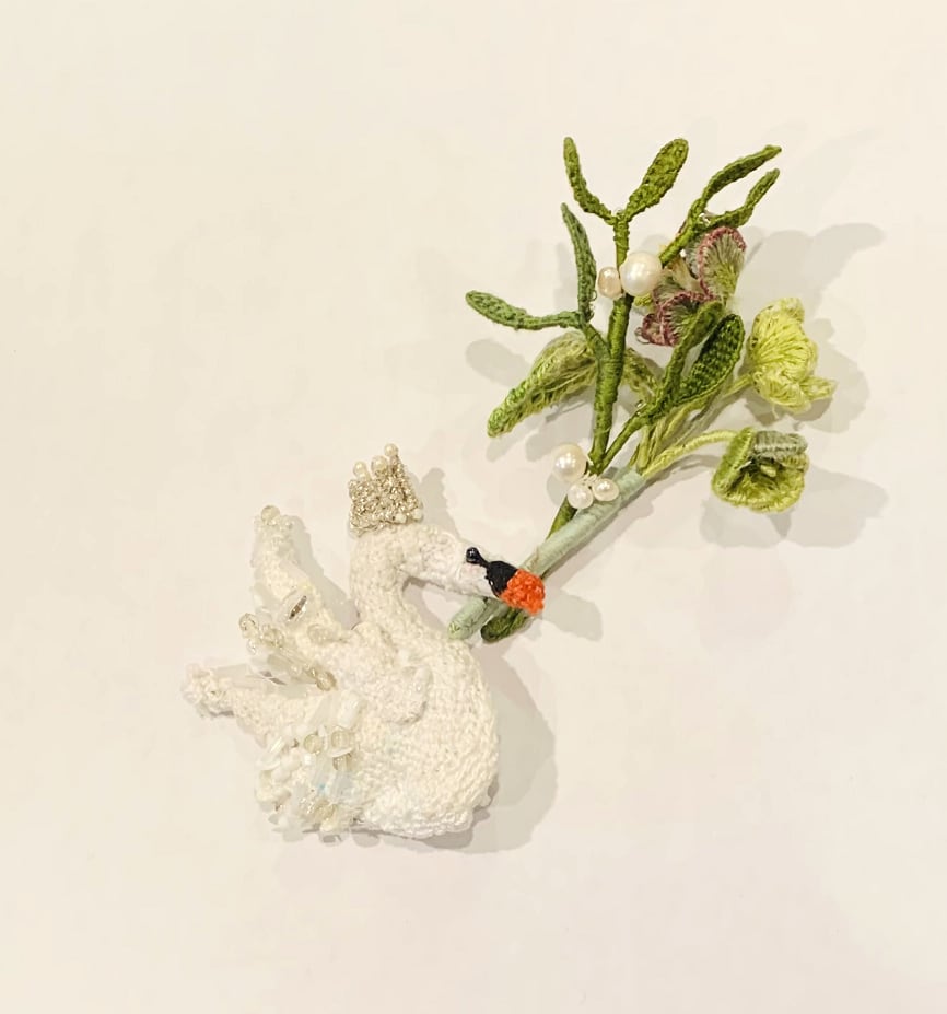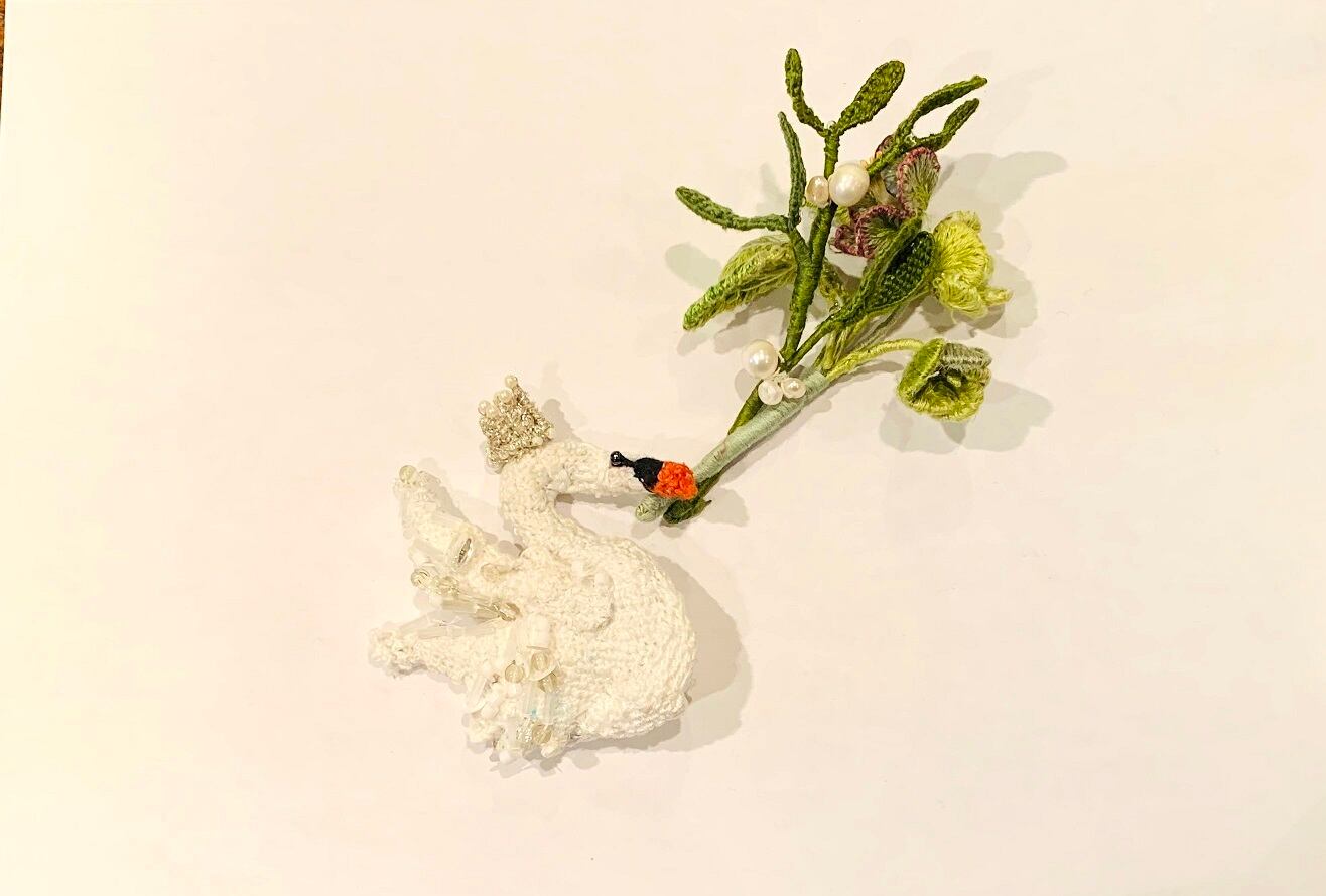 刺繡のスワンのブローチと花のセット